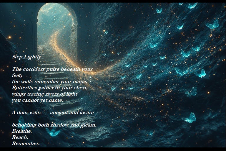The butterflies are not symbols of change, but carriers of memory — fragments of light returning home. They gather when the air begins to shift, when the unseen starts to breathe through stone.